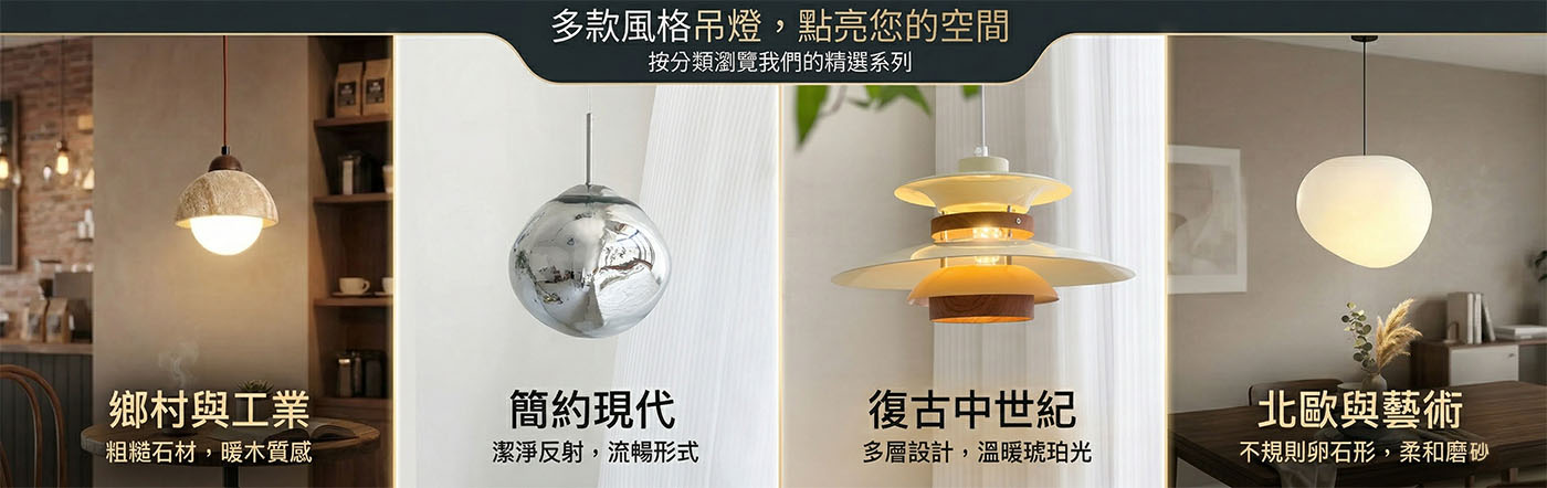 北歐風吊燈:以原木、白色金屬為主,線條柔和,適合營造溫馨的用餐環境。